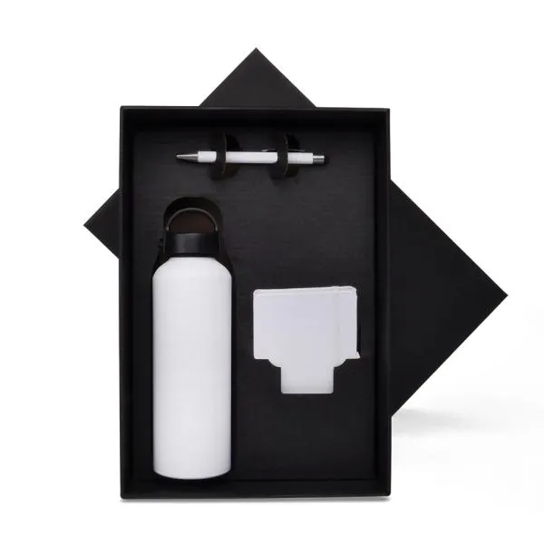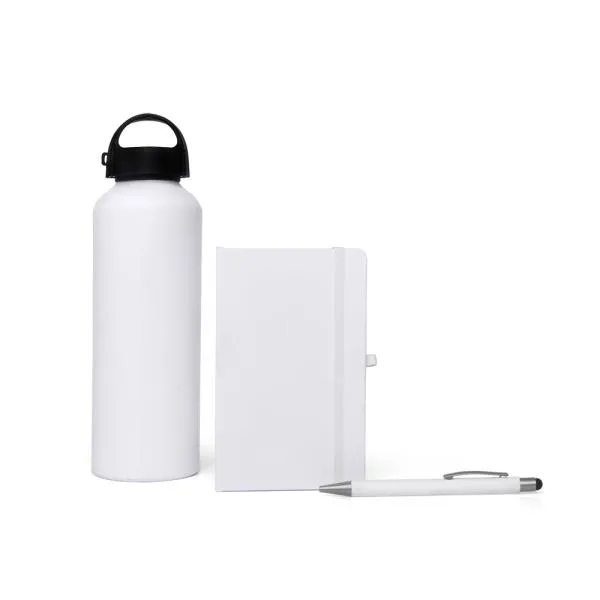 Kit boas vindas. Conta com garrafa branca em alumínio com capacidade de 600 ml; caderno para anotações branco com capa dura e caneta esferográfica em alumínio branca.